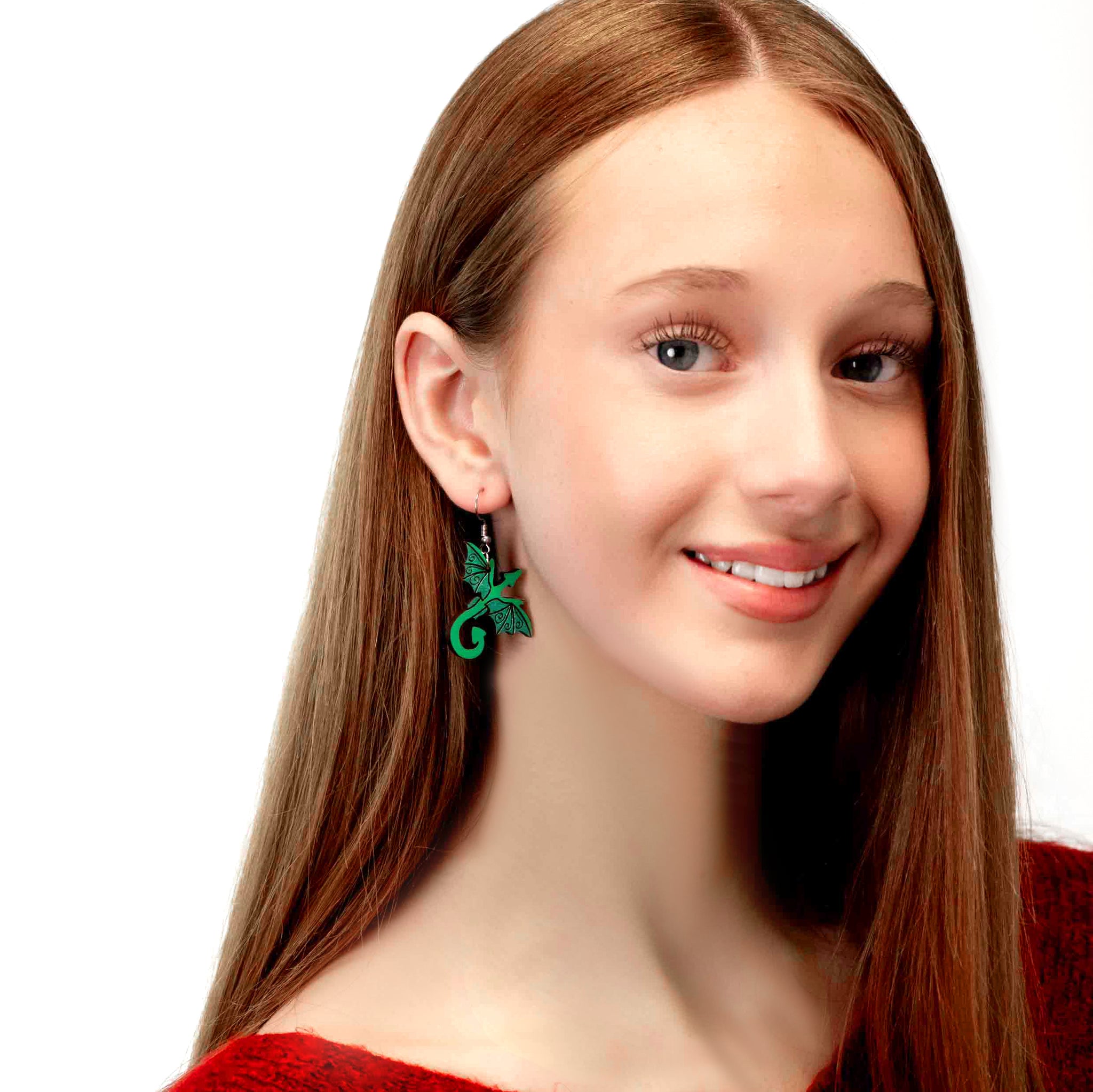 Hand-painted Wooden Green Flying Dragon Hook Earrings - PEO14262D
