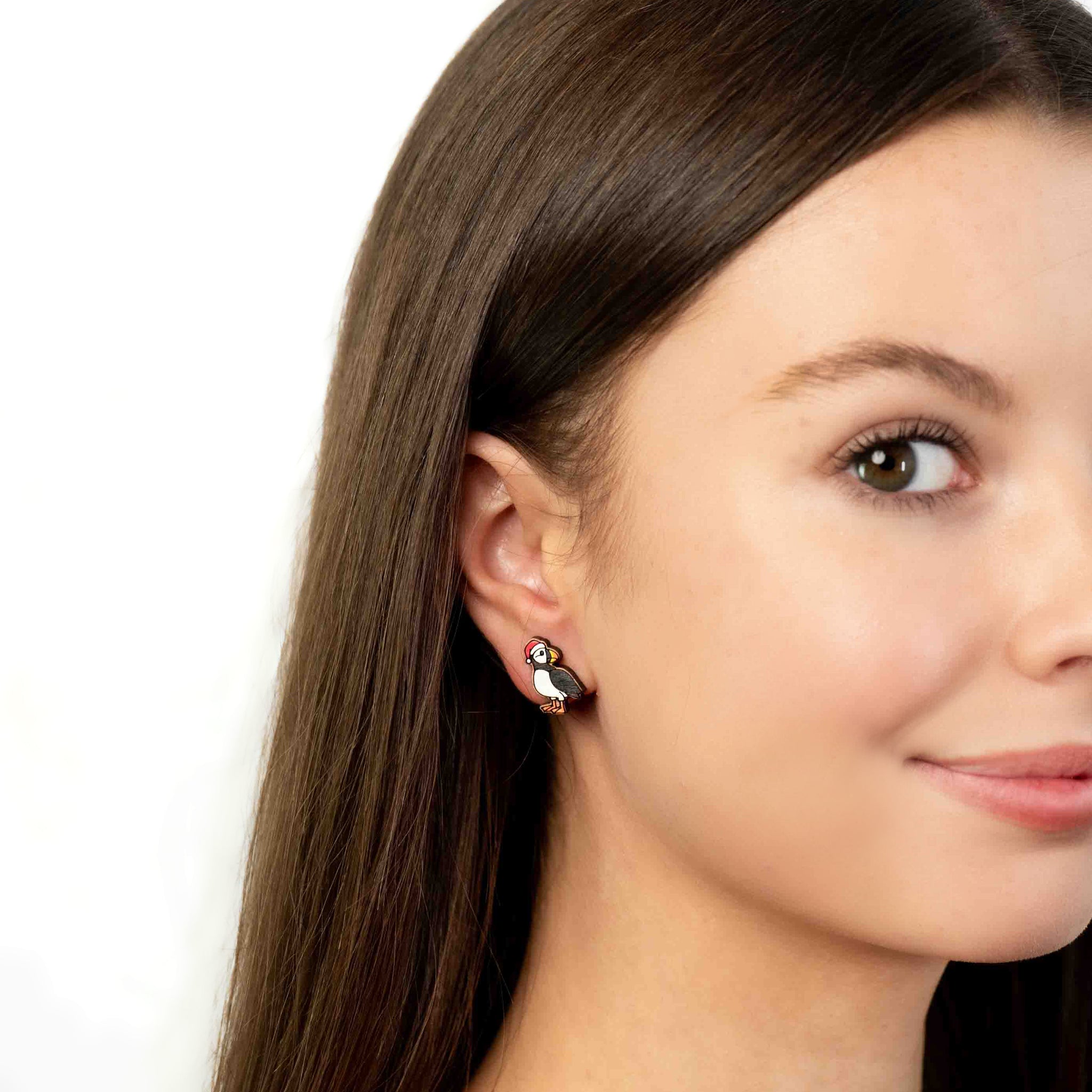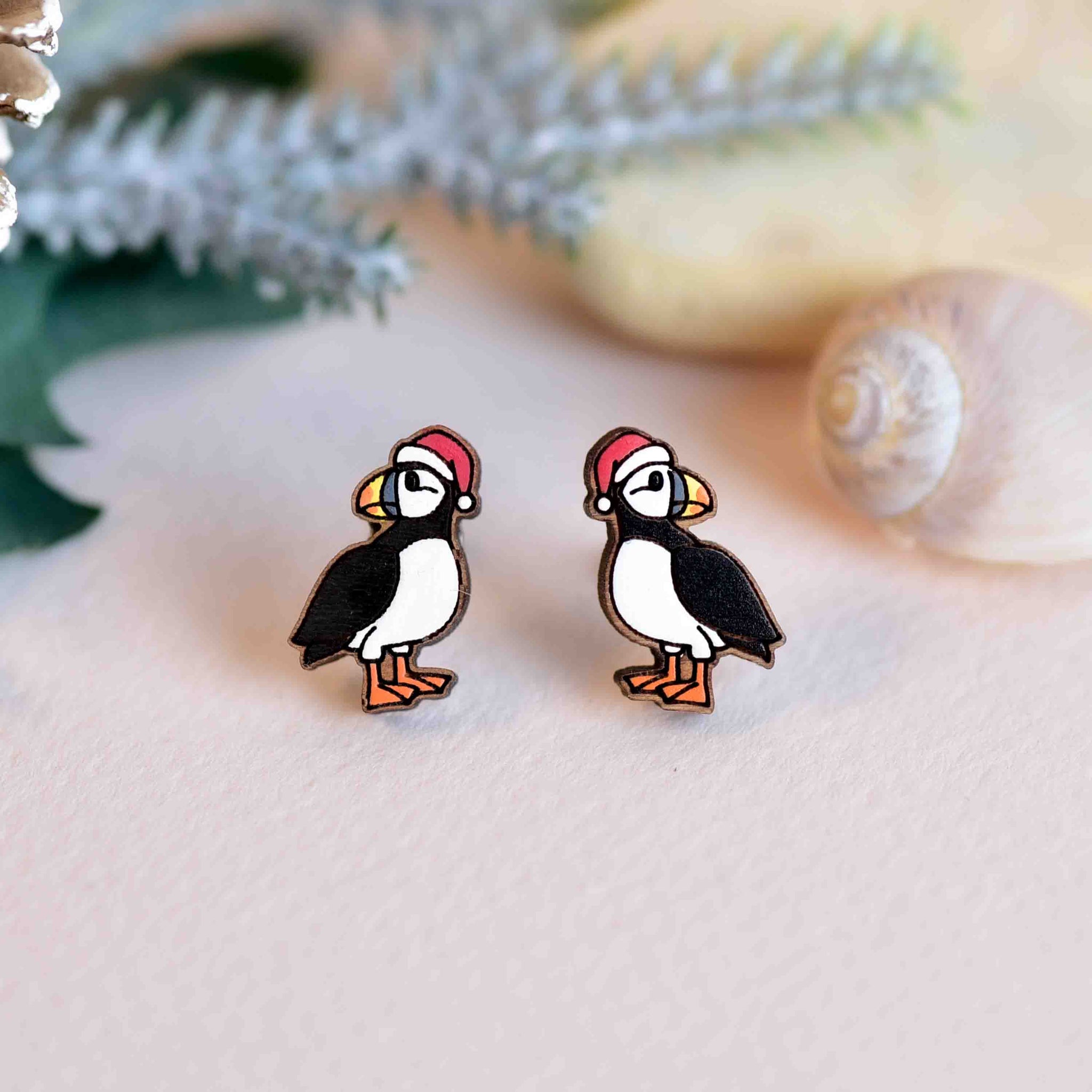 Christmas Puffin Bird in Red Santa Hat Wood Earrings - PEB12056