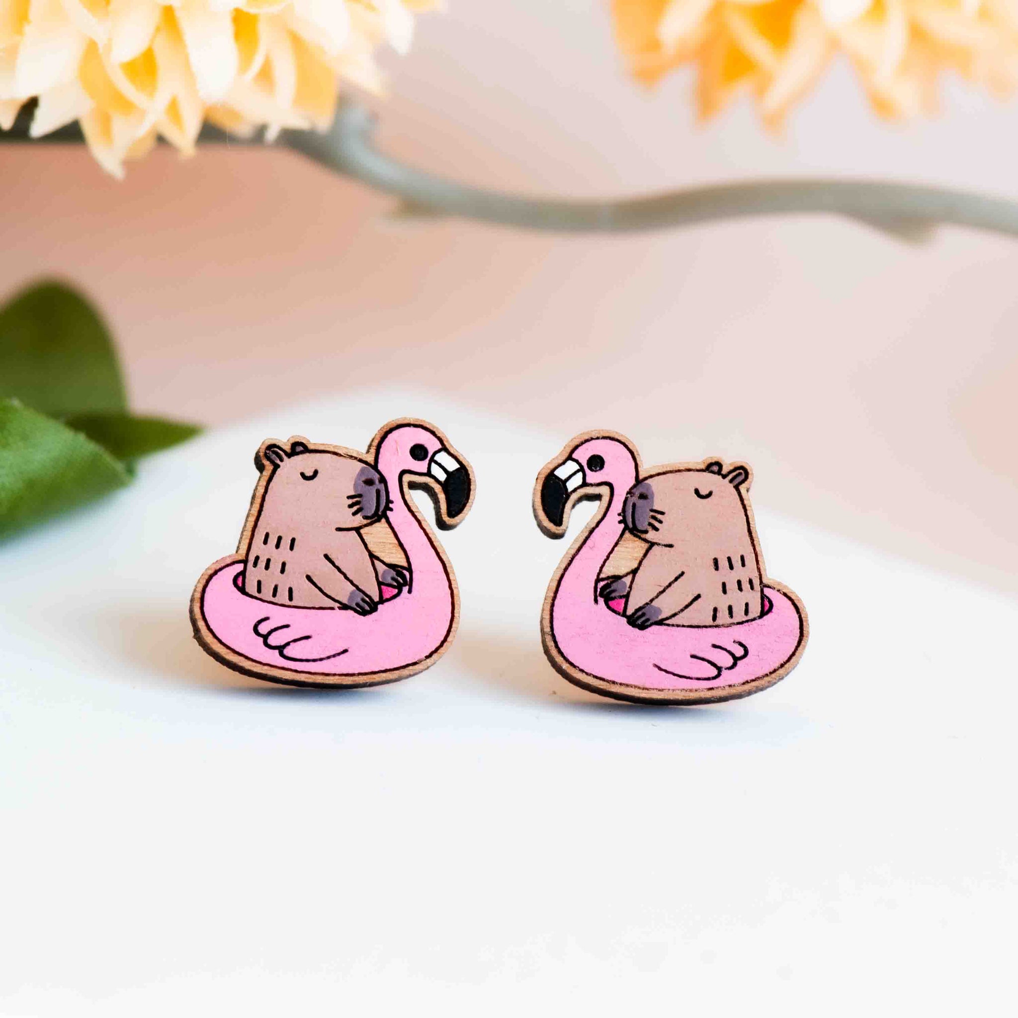 Hand-painted Wooden Capybara Ride On Inflatable Flamingo Earrings - PEL10459