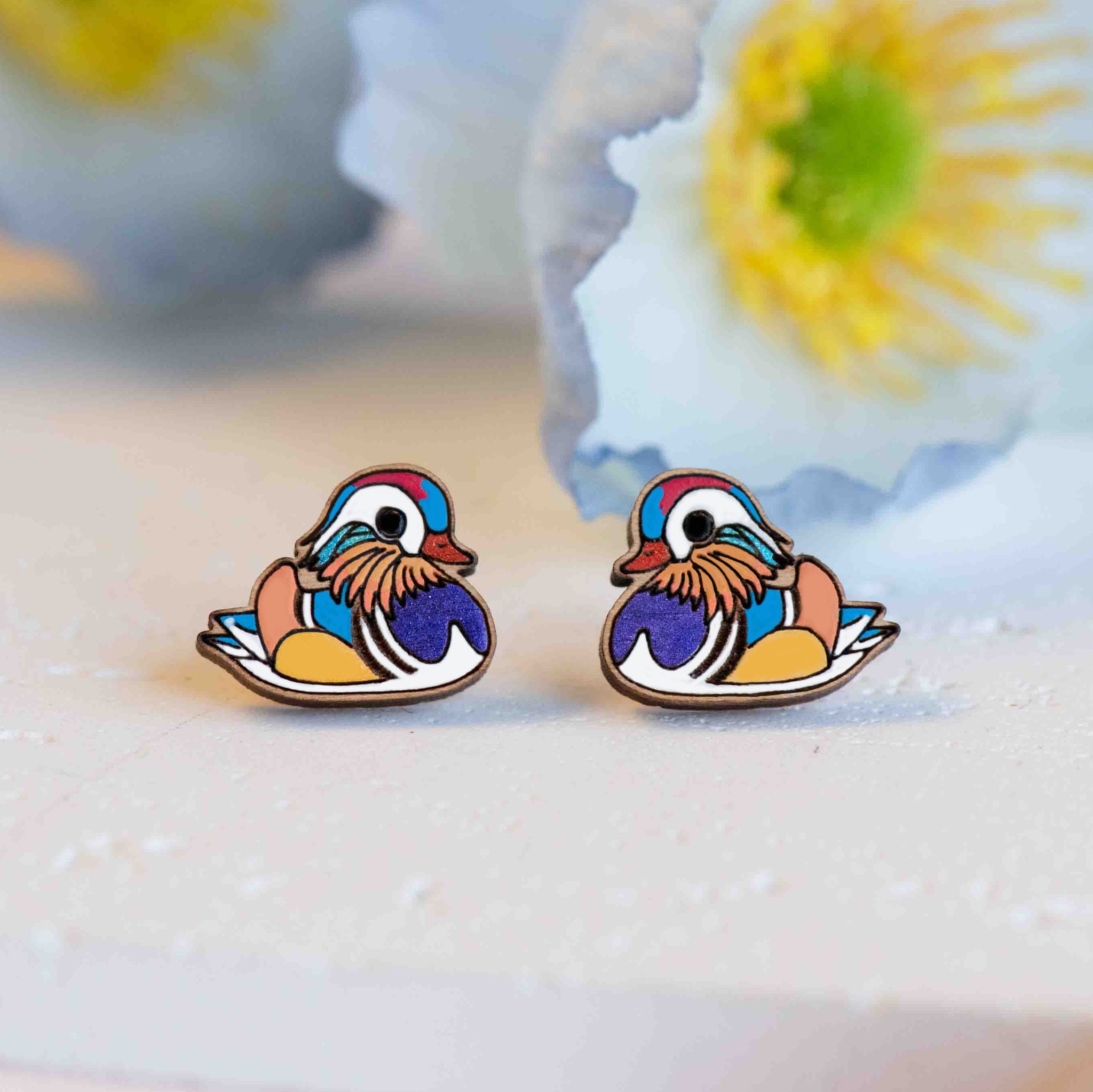 Hand-painted Wooden Mandarin Duck Earrings - PEB12103