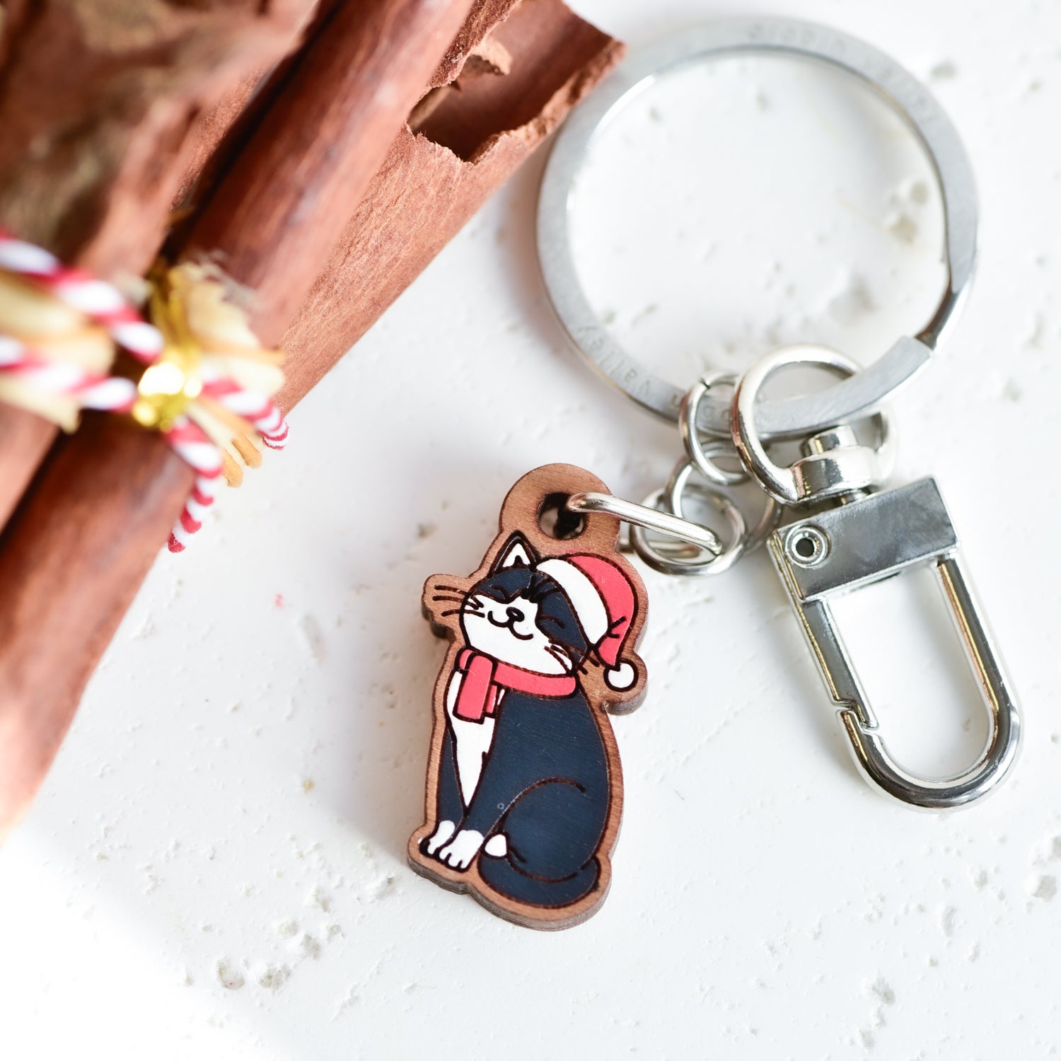 Hand-painted Wooden Christmas Black White Cat Keyring - KL20314