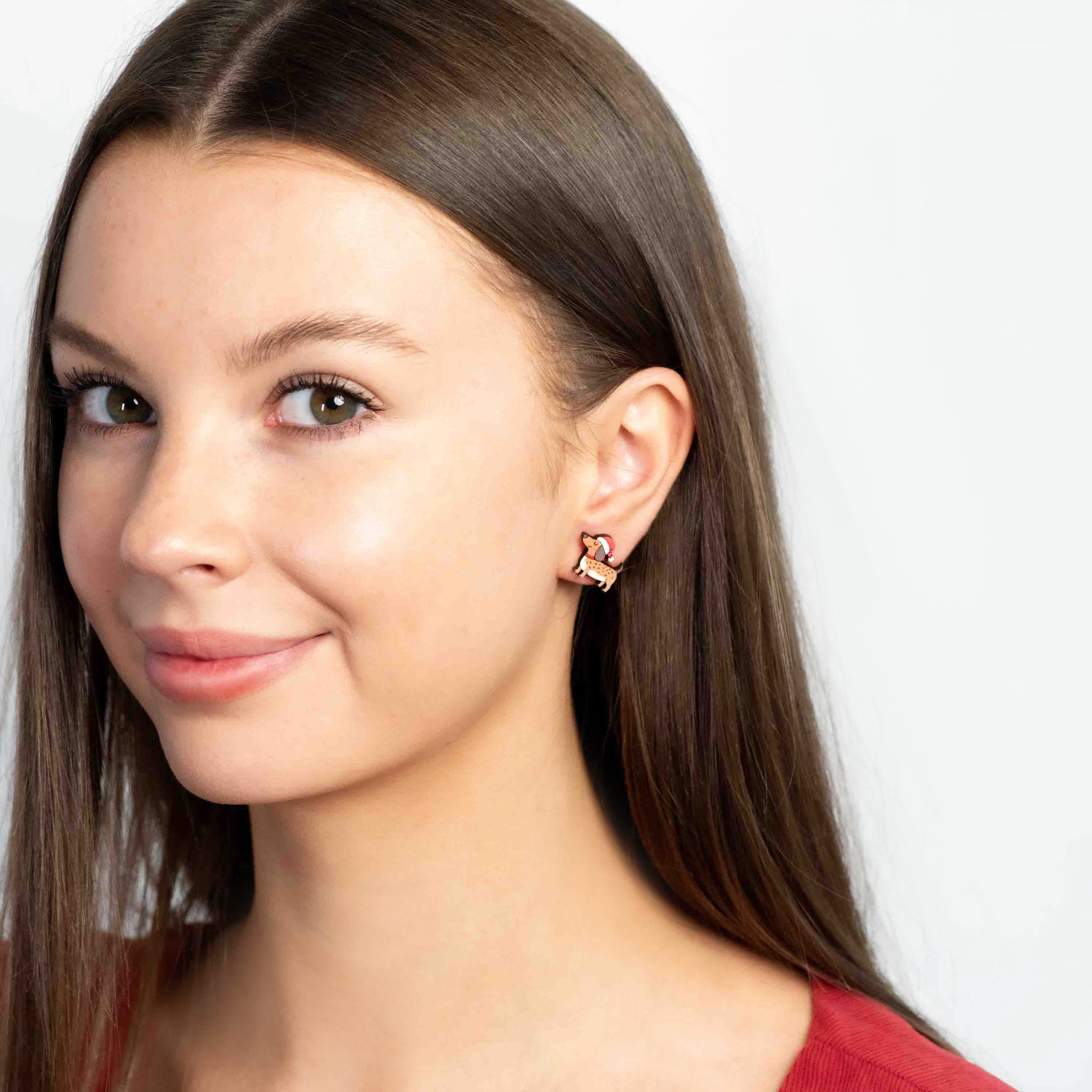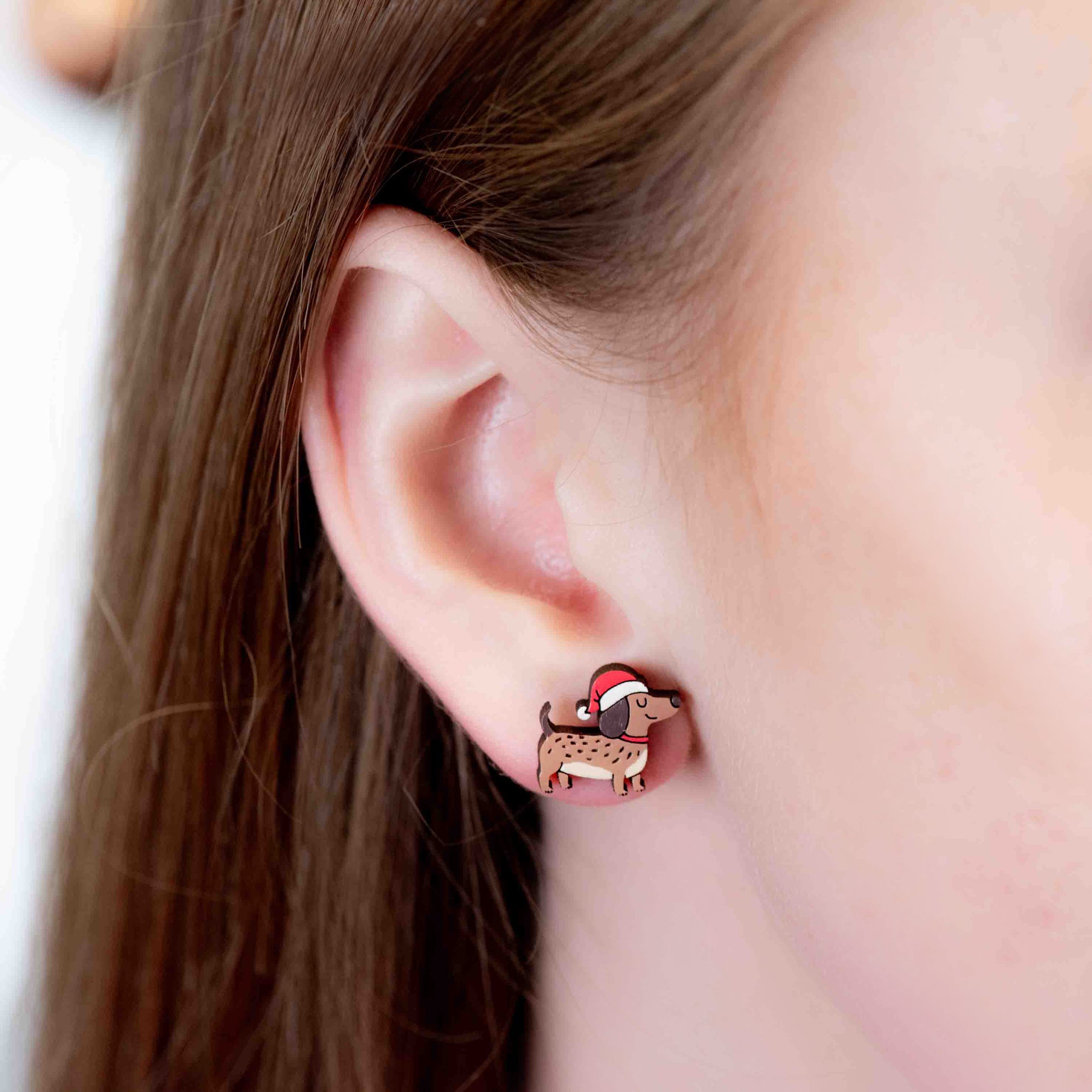 Hand-painted Wooden Xmas Smiley Dachshund Stud Earrings - PEL10507X