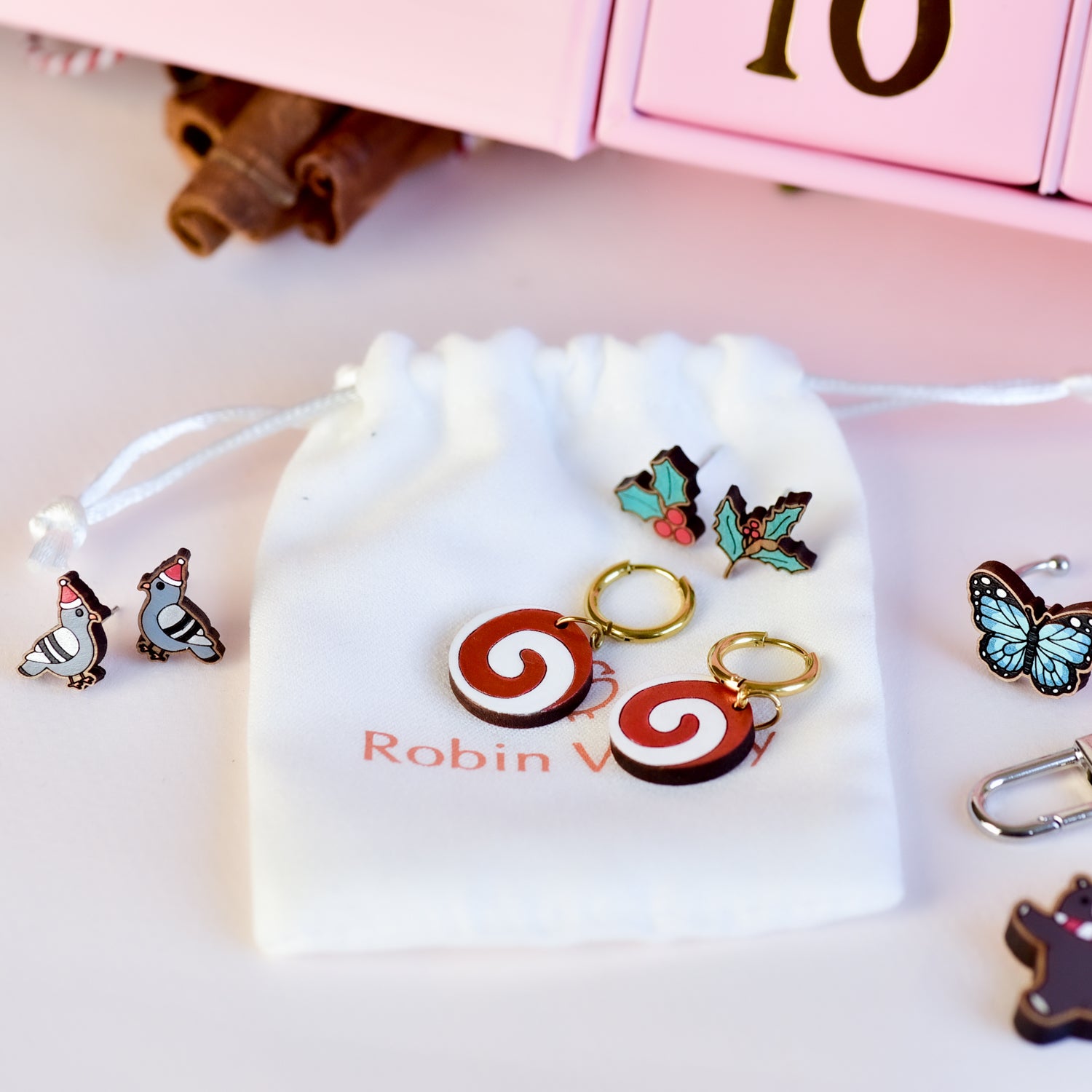 Inside 12 little pink drawers of delight, you’ll discover beautifully hand-painted wooden jewellery and accessories — including 3 pairs of hoop or drop earrings and the remaining 9 items can be chosen from any other Robin Valley collection to surprise your loved ones — or you can let us curate a hand-picked mystery selection just for you.