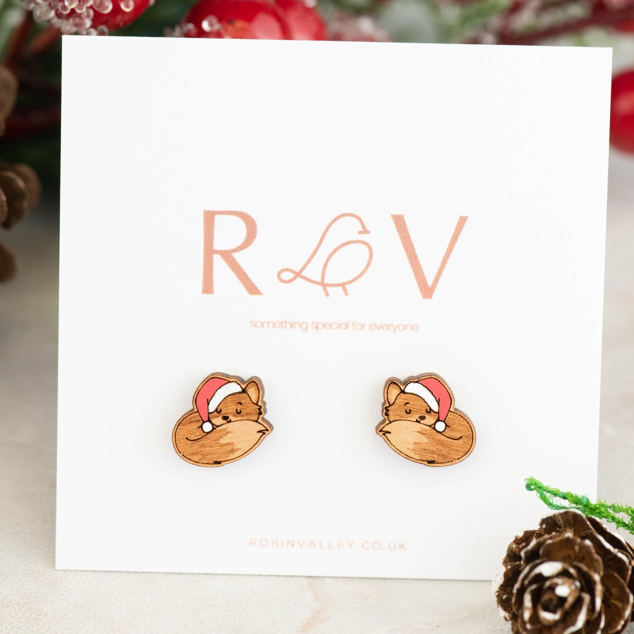 Sleeping Fox in Santa Hat Wooden Earrings -PEL10160