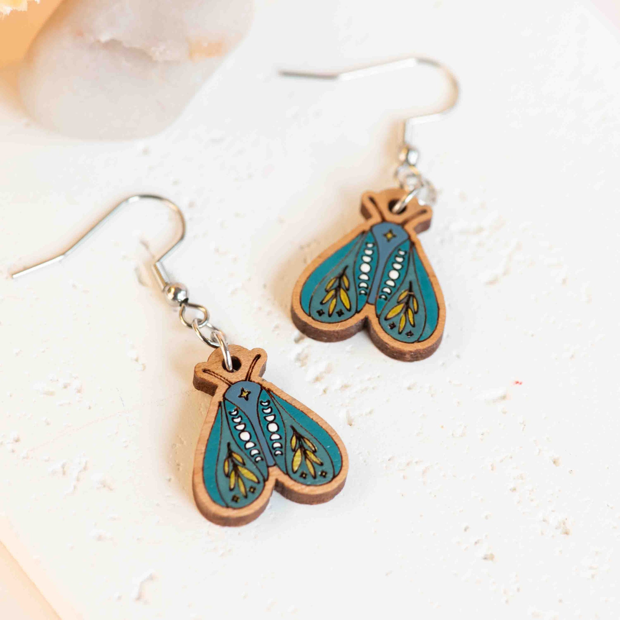Hand-painted Luna Phases Moth Wooden Hook Earrings - PEO14267D
