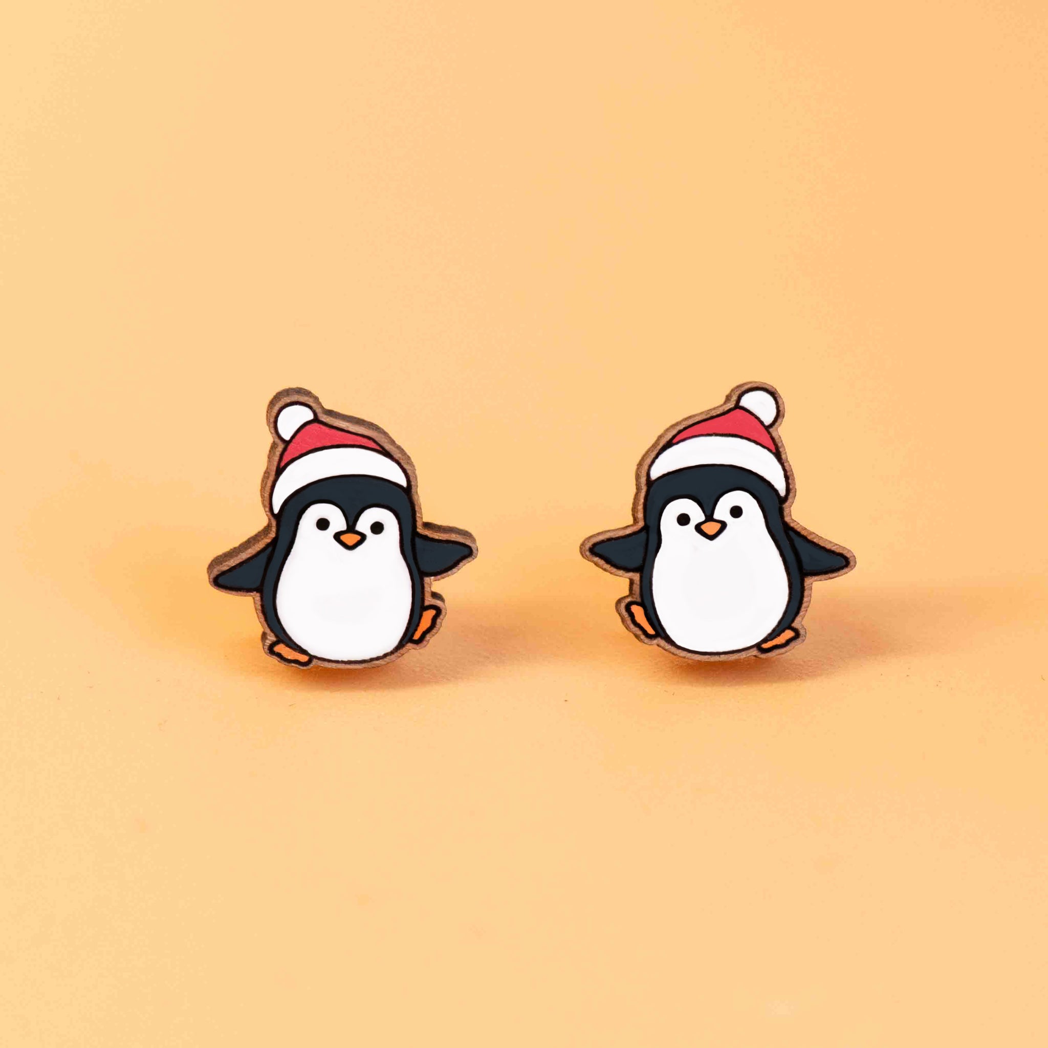 Hand-painted Christmas Walking Penguin Wooden Earrings - PEL10357