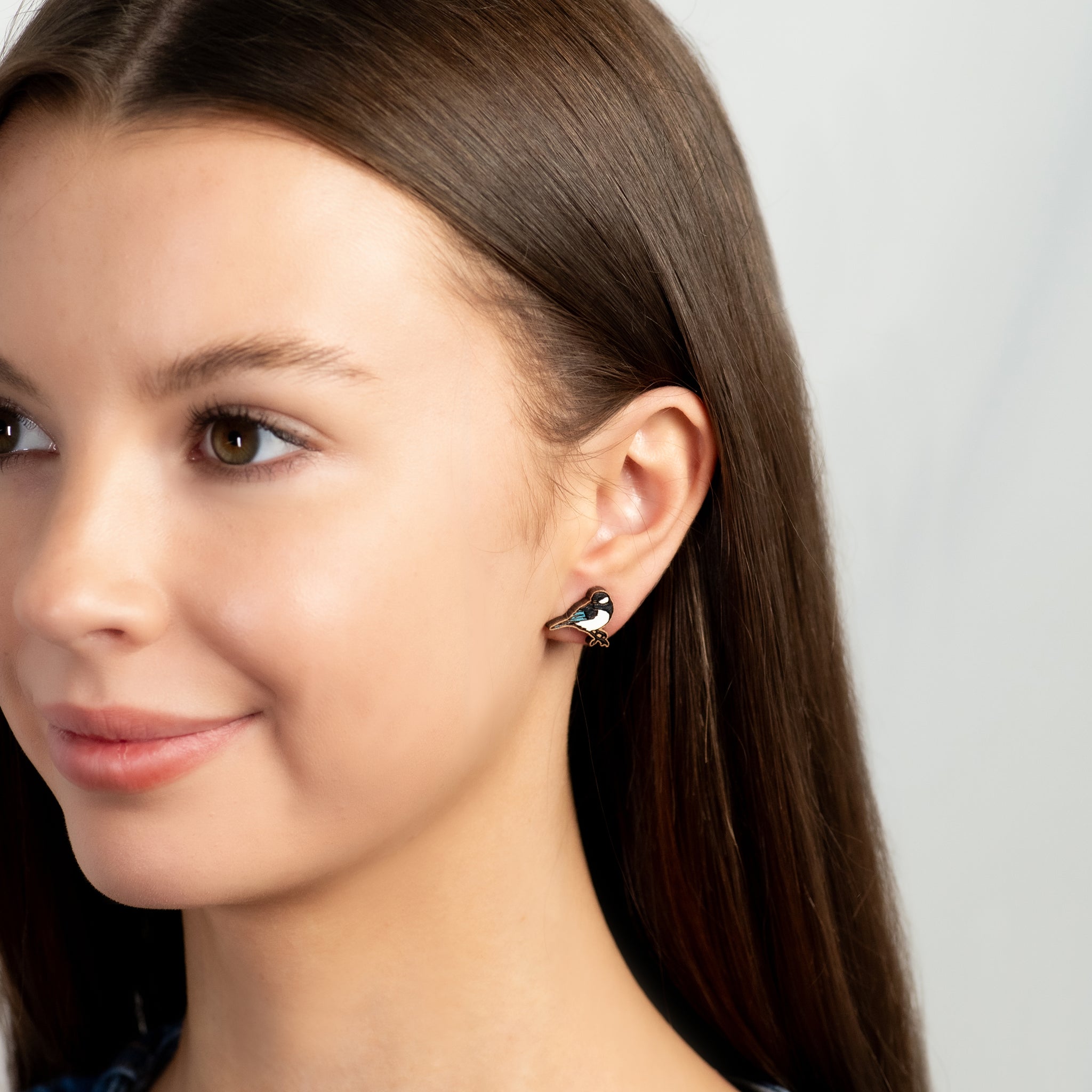 Hand-painted Magpie Wooden Stud Earrings - PEB12085