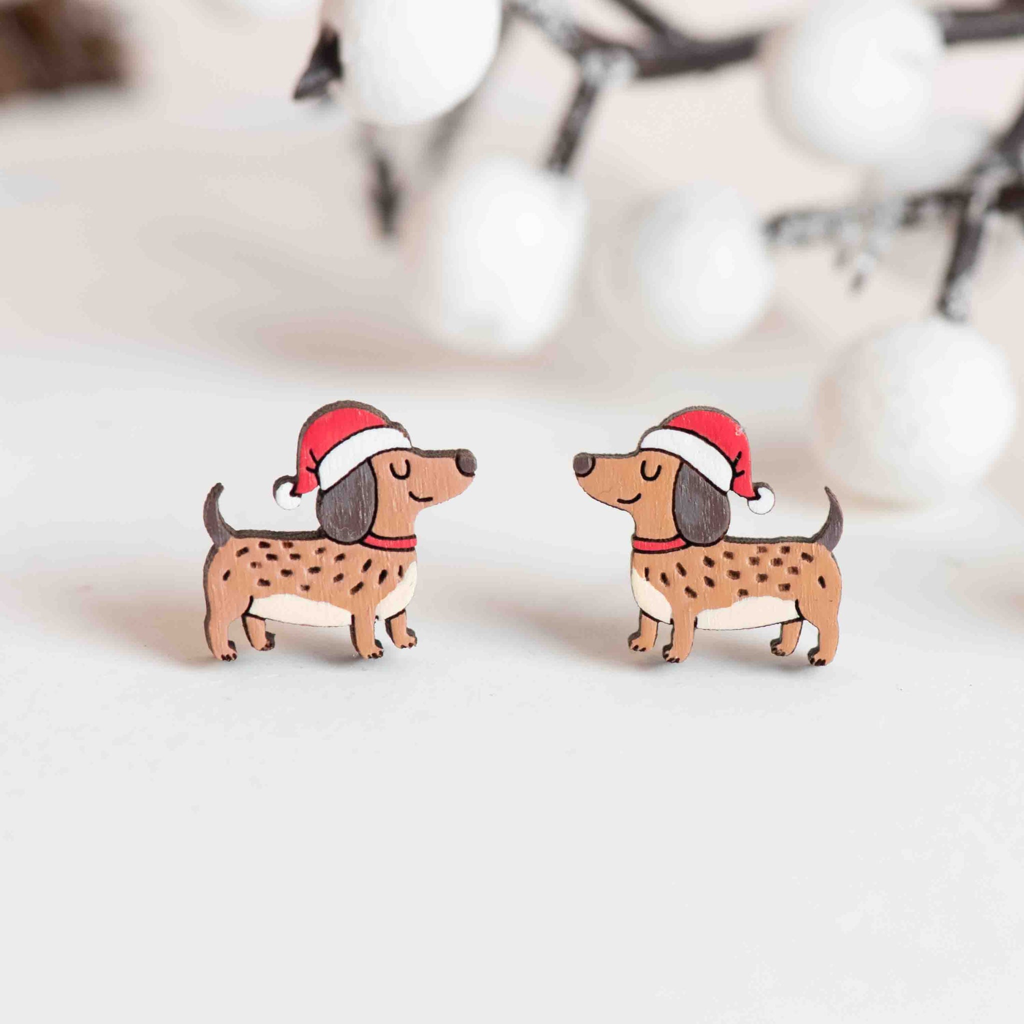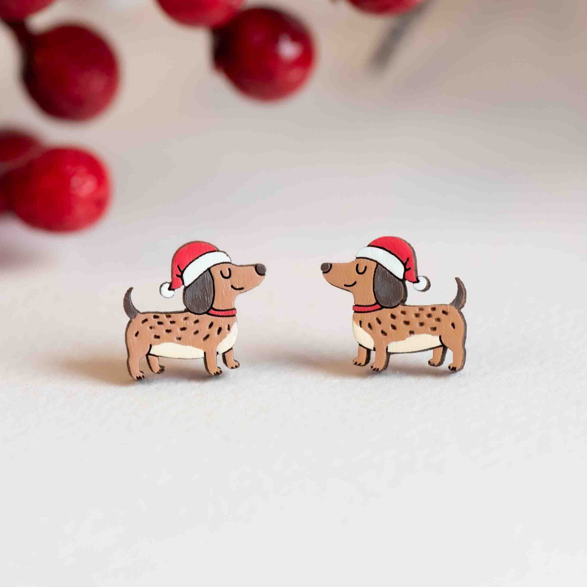 Hand-painted Xmas Smiley Dachshund Stud Earrings - PEL10507X