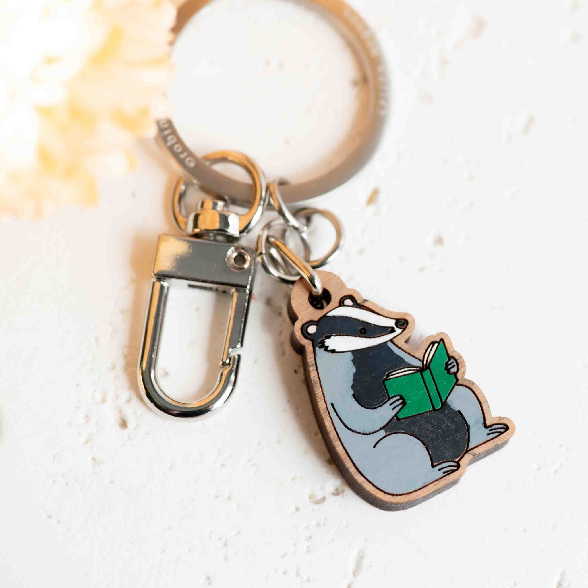Hand-painted Badger Reading Wooden Keyring - KL20506