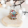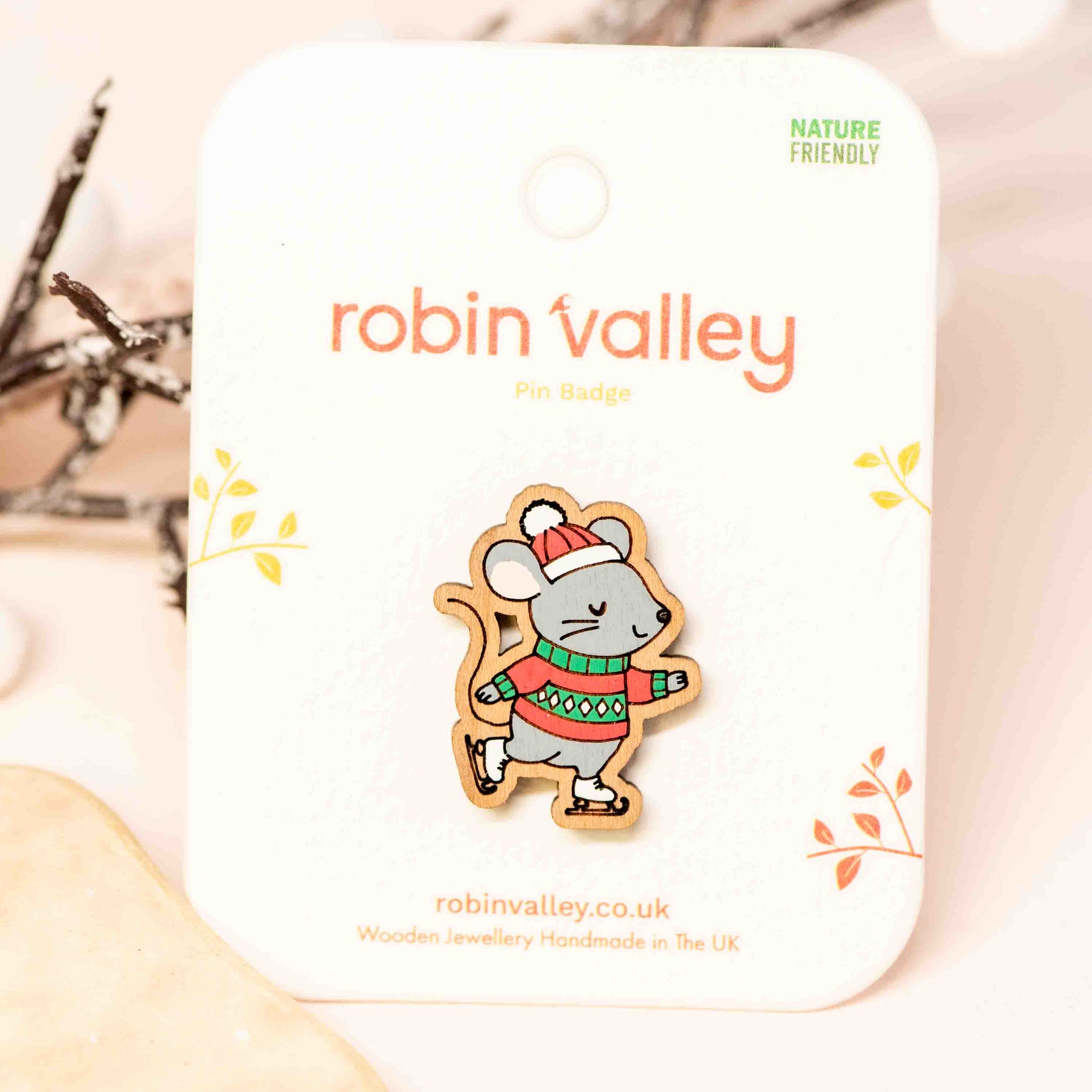 Hand-painted Xmas Skating Little Mouse Wooden Pin Badge - PL40505