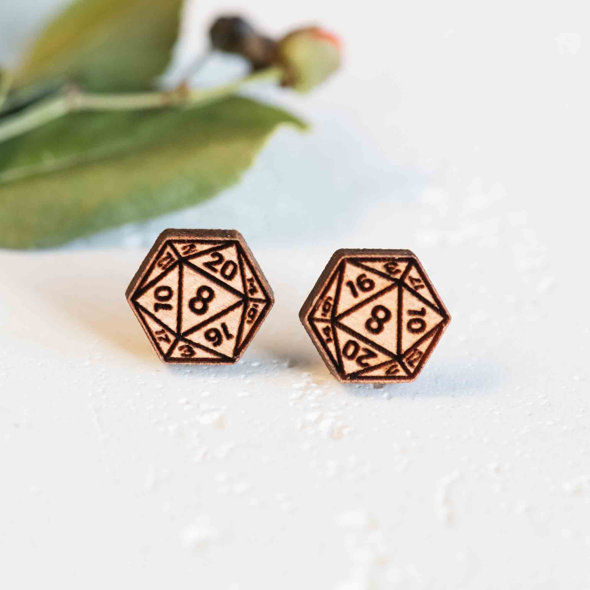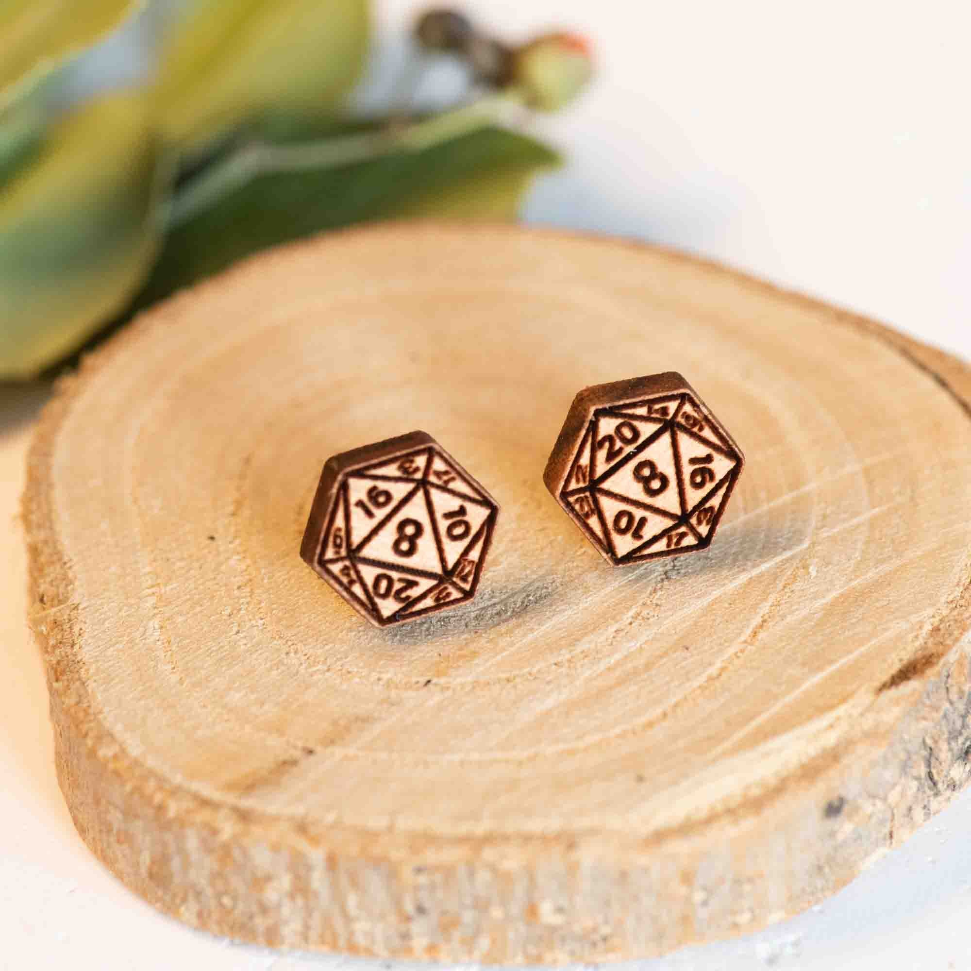 Unleash your unique style with these D20 Dice Wooden Stud Earrings! Perfect for tabletop gamers and RPG enthusiasts. Made with high-quality solid cherry wood and lab test approved safe stainless steel, they feature intricately carved D20 dice, ensuring each pair is unique. Lightweight and comfortable, they're ideal for daily wear or special gaming events. Elevate your accessory game and roll for style with these unique earrings. Great gift for D&D fans