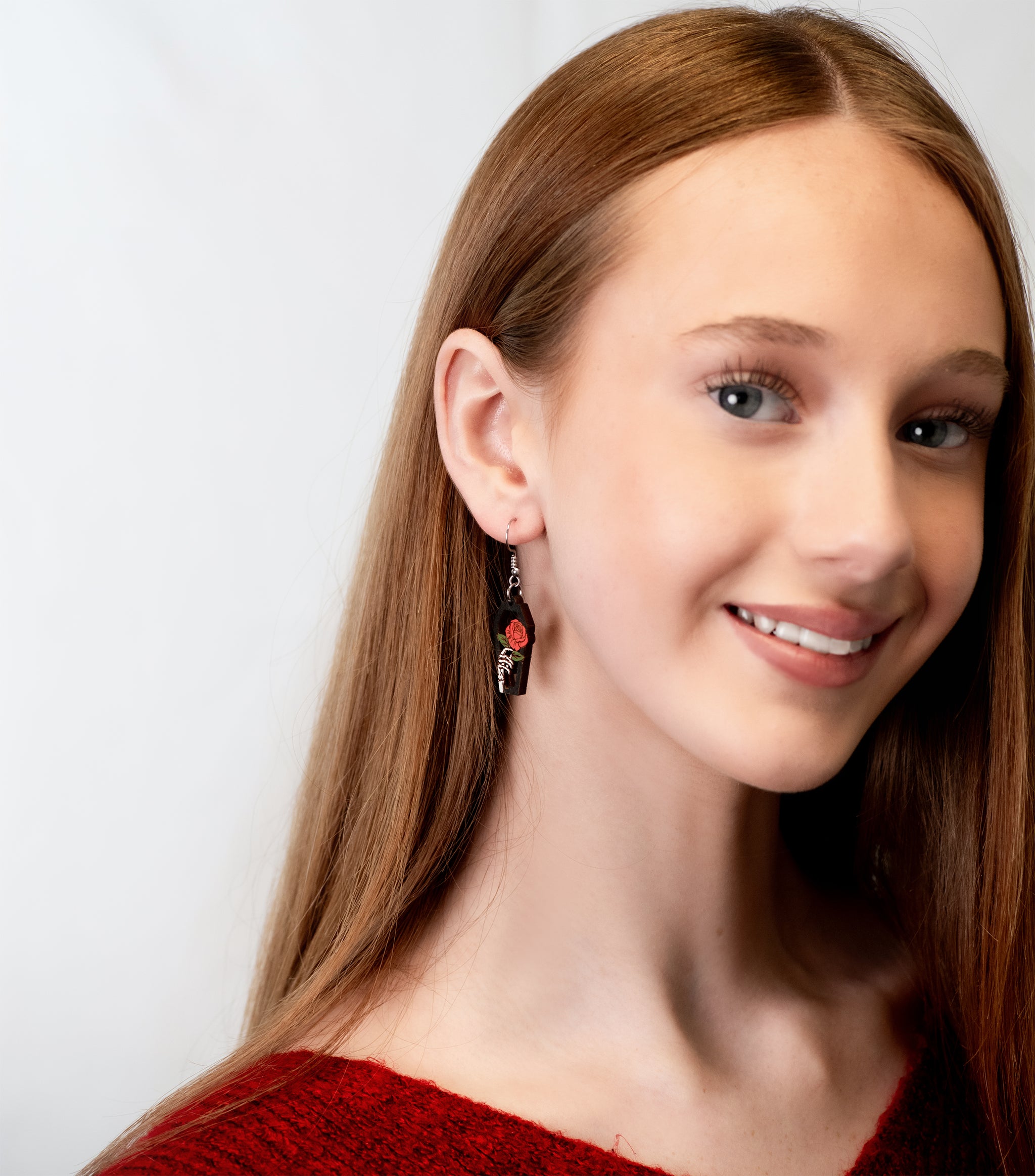 Hand-painted Coffin Hand Rose Wooden Hook Earrings - PET15483D