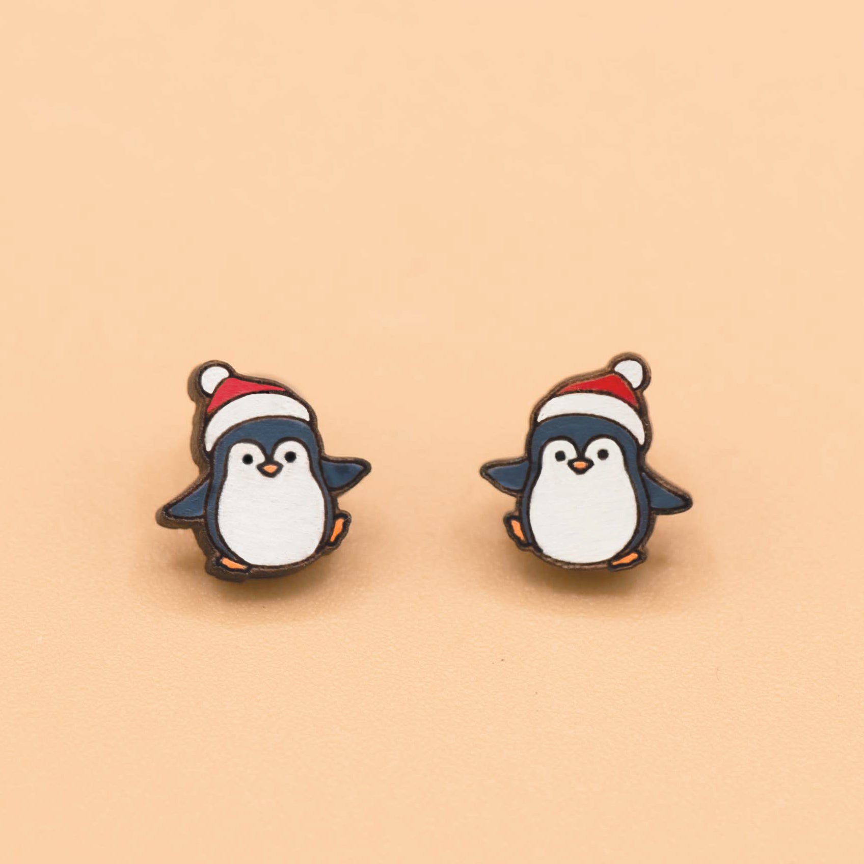 Hand-painted Christmas Walking Penguin Wooden Earrings - PEL10357