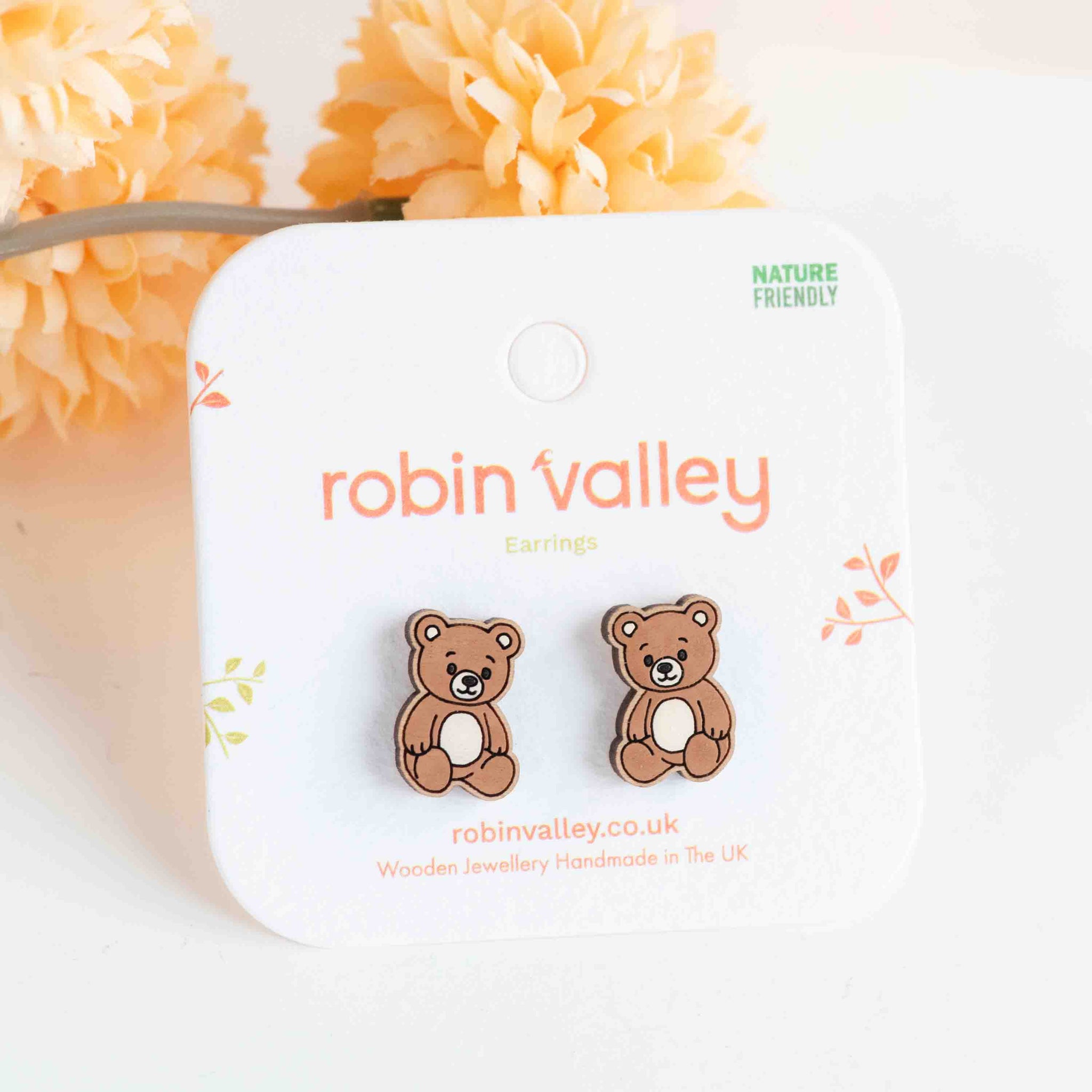 Hand-painted Sitting Teddy Wooden Stud Earrings - PEL10444