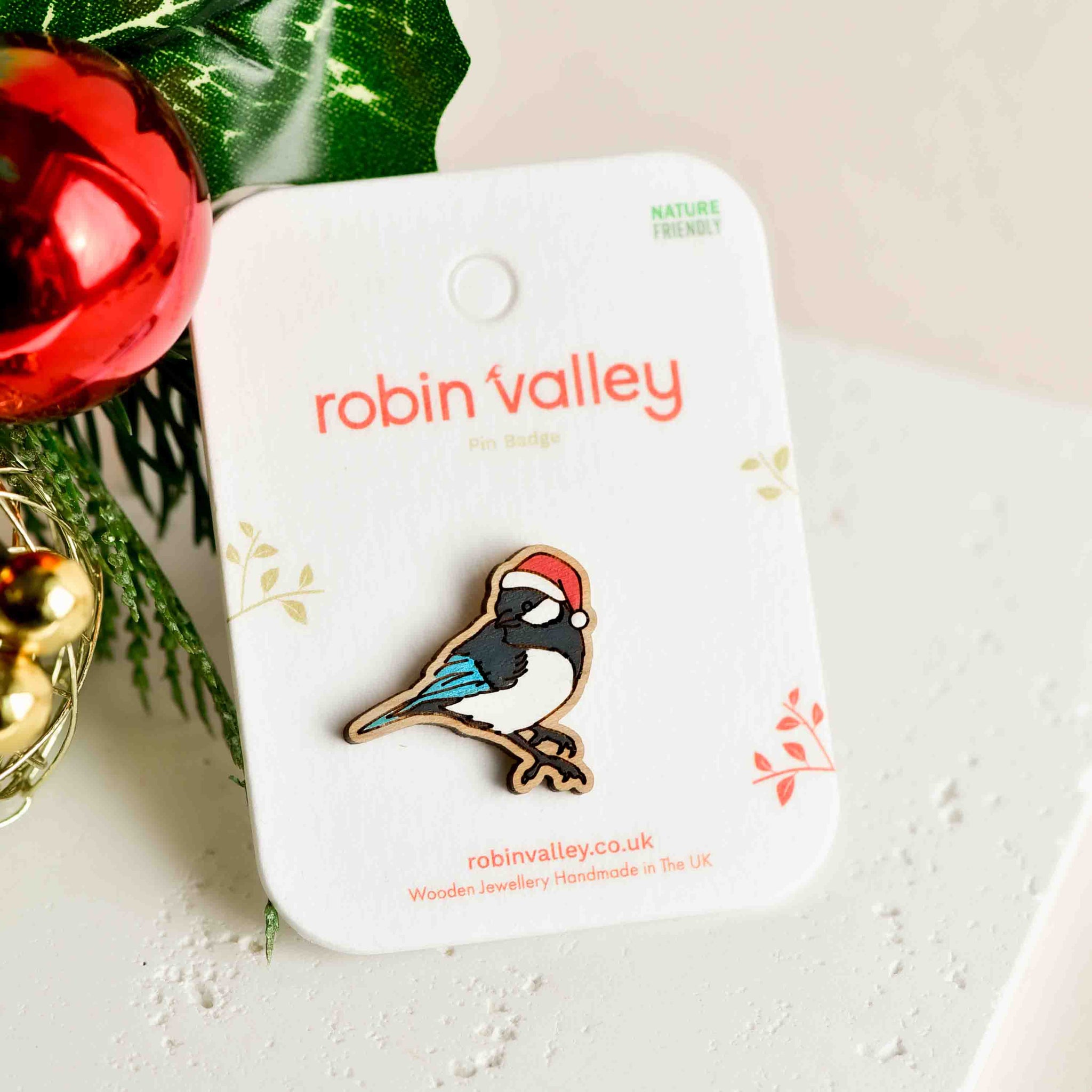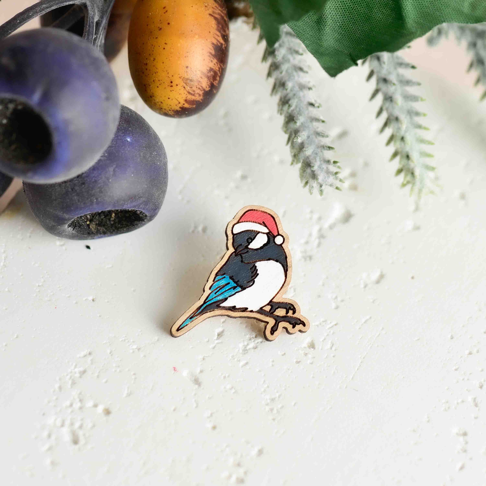 Hand-painted Wooden Xmas Magpie Pin Badge - PB42085X