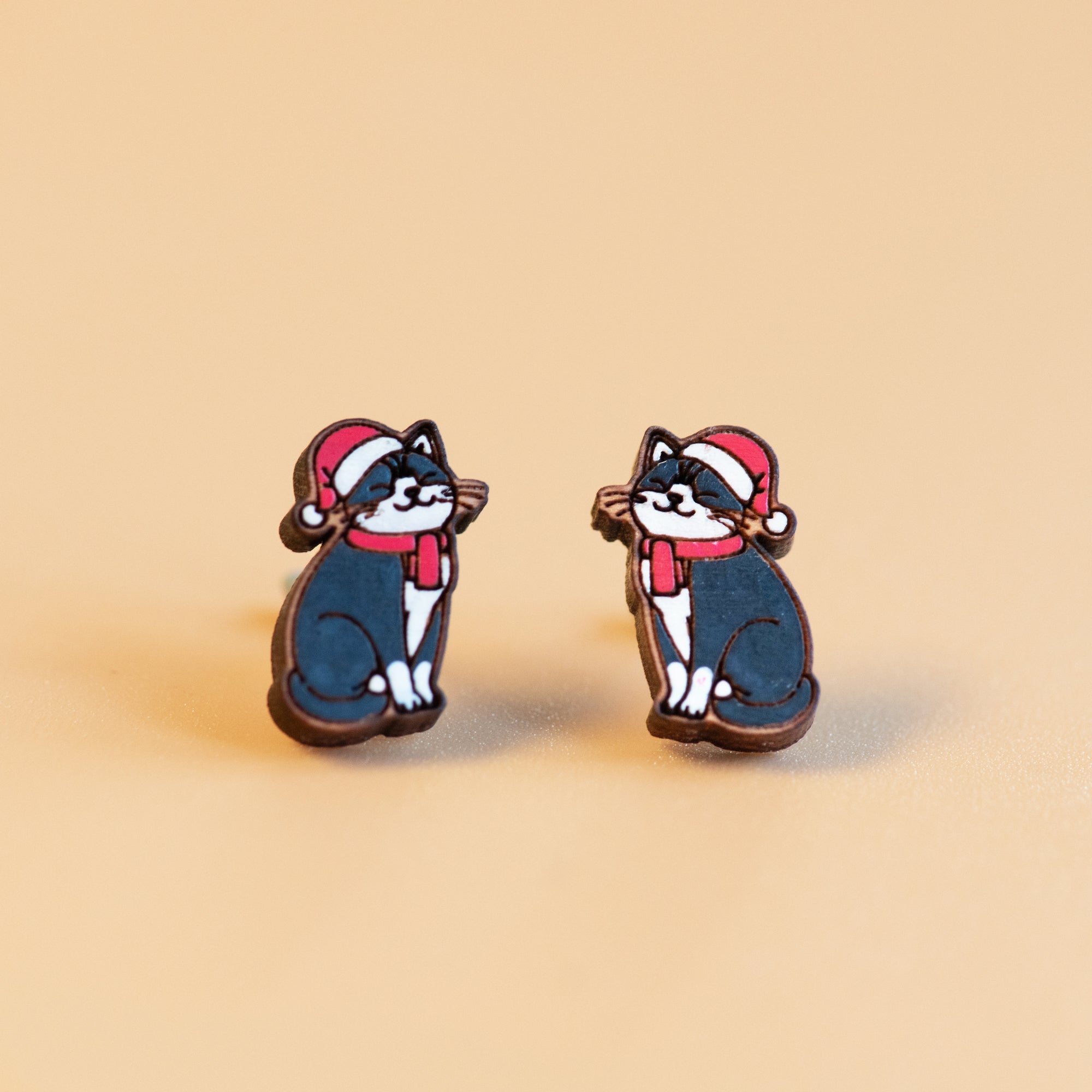 Hand-painted Christmas Wooden Black and Whilte Cat Earrings - PEL10262